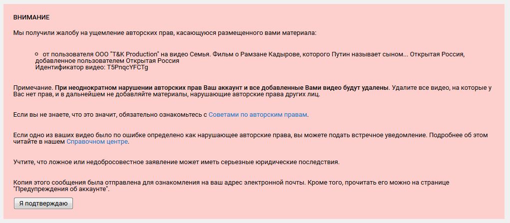 В любом случае, жалоба не имеет никаких оснований, так как фильм содержит только кадры, принадлежащие Открытой России, и кадры новостей, которые не защищены авторским правом. В проекте также использованы материалы фильма «Рамзан и его команда» Леонида Канфера, интервью Рамзана Кадырова Марианне Максимовской в программе «Неделя», клип «Нур-Жовхар» Винсента Мура, о чем есть надлежащие сообщения в описании видео, как того требует закон.